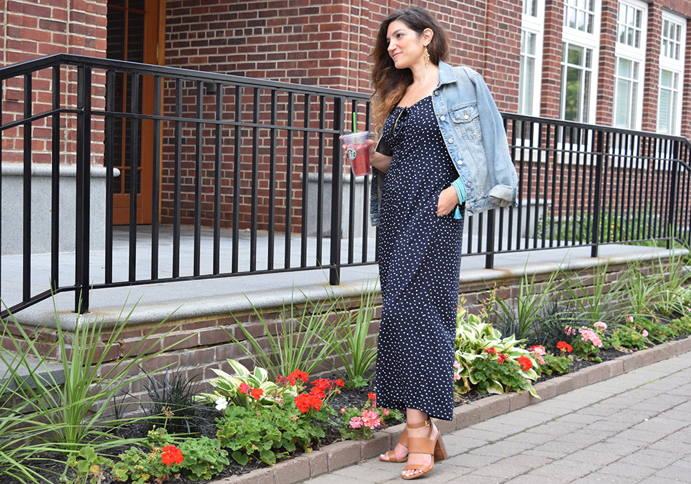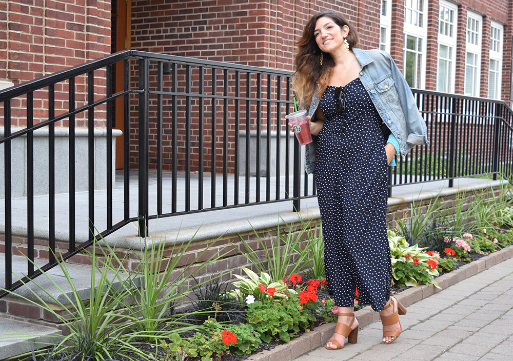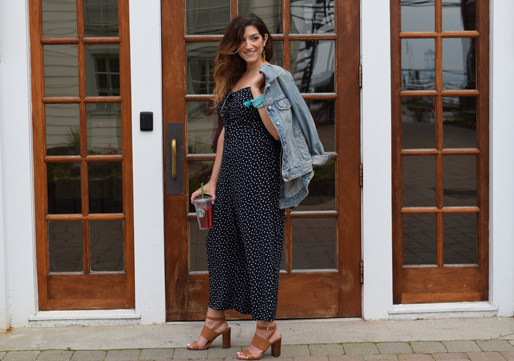 I work in an office environment all year round and this polka dot jumpsuit is so versatile and comfy! It’s a great piece for teachers back to school and it can easily transition from day to night. Paired with a chunky heel, this outfit makes it so easy to wear all day long and feel super stylish in the process! And you know the best part, it has pockets!!!