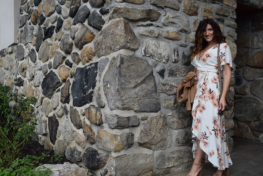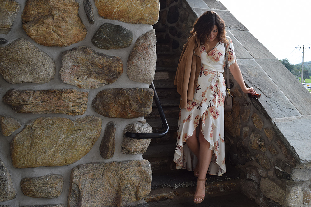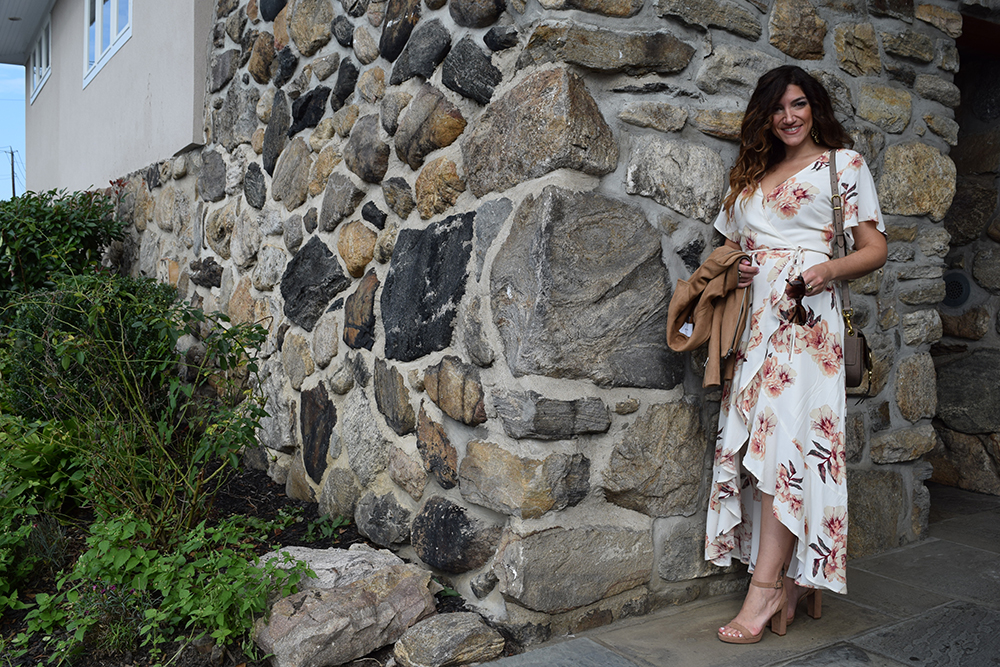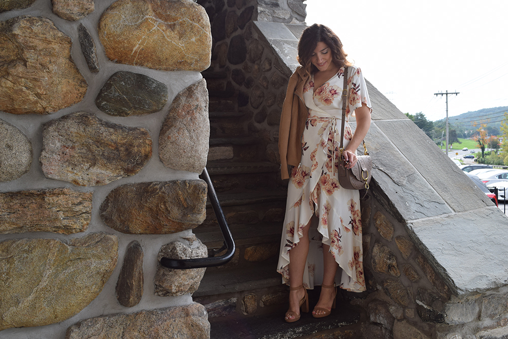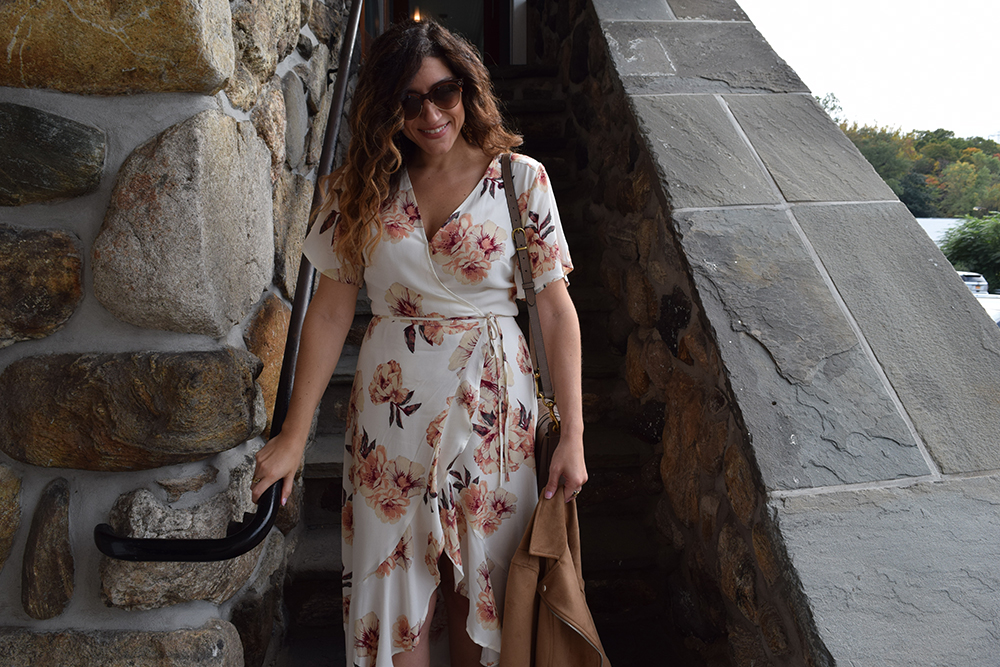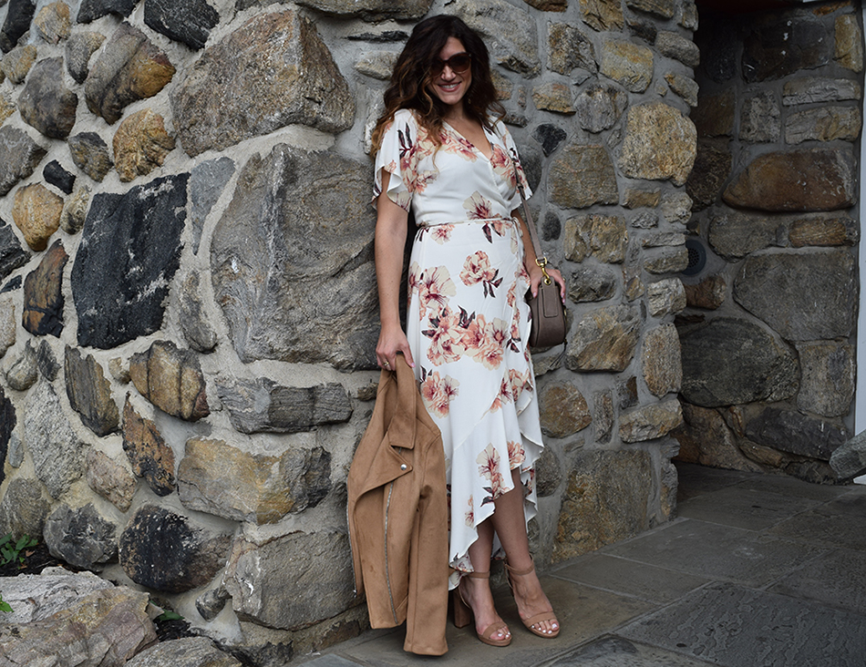 This floral wrap dress is the perfect all occasion dress, I think its my favorite piece from the Nordstrom Anniversary Sale. I was dyyyyying to have a reason to wear it!! I recently wore this to my parents 40th wedding anniversary and it was 80 degrees that day, in New York in October! It’s comfortable and super versatile. Dress it up with evening shoes, dress it down with flats. It can transition into fall with a moto jacket and booties. Wear it to a baby shower, a bridal shower, dinner with the girls or even a day wedding. I paired it with a boho cross body bag and my faux suede moto jacket from Old Navy. The camel color jacket perfectly picks up the warm tones of the flowers in the dress. And the best part….. this dress was under $60! I love a great deal, don’t you??? Let me know what you think and how you would wear it? Comments are always welcome – M.Co